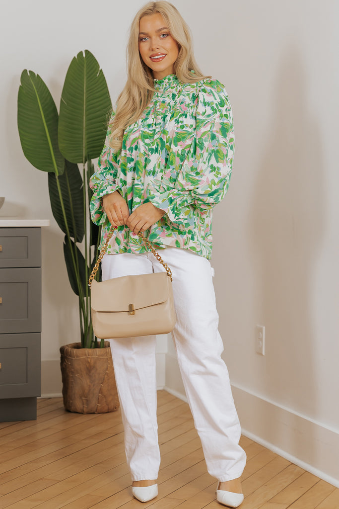 - This printed blouse adds a touch of botanical charm to your ensemble.